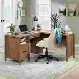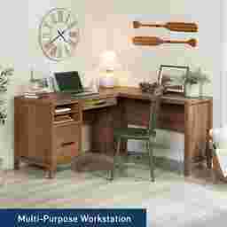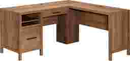 The Riddlelife brown desk has a file drawer with full extension slides that holds letter or European size hanging files. Pencil drawer features metal runners, and safety stops for convenient storage space. Open storage features an adjustable shelf, perfect for reams of paper and office supplies. Finished on all sides for versatile placement, even in the center of the room. Cord management includes two desktop grommets to reduce cord clutter. Quick and easy assembly with T-lock drawer system and slide-on moldings. Customer assembly is required.