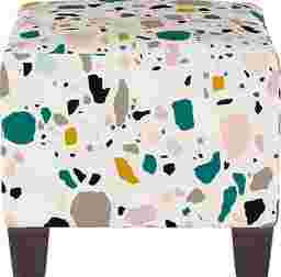 This ottoman is designed to make a simple yet stylish statement, featuring a sturdy geometric design atop a set of solid block legs. It is fully cushioned and hand-upholstered in Illinois, USA. Customer assembly is required. Spot clean only. 100% Cotton This piece is made to order and may take up to 6 weeks to deliver.