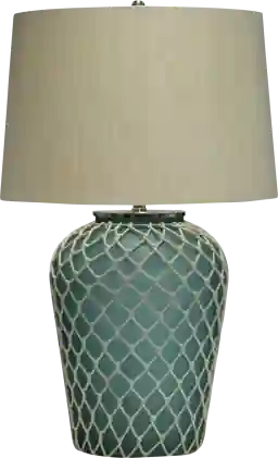 The perfect solution to coastal living - the Ridge Cove aqua satin glass lamp body wrapped in a natural cotton fish net finished nicely with a natural linen barrel shade. Partial assembly may be required.