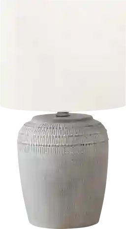 Refresh your living room, bedroom, or home office with the Ridgebit Gray Lamp. The elegant, jar shaped gray base with a textured finish along the top is paired with a white fabric shade for a contemporary upgrade. This lighting accent is ready to brighten any corner of your home, whether placed on an end or side table in a living room, on your bedroom nightstand, or your office desk, providing just the right amount of light to create the right ambiance. Embrace the classic styling of this ceramic table lamp with a modern drum shade for a fashionable and on-trend accent piece that compliments all decors. Partial assembly may be required.
