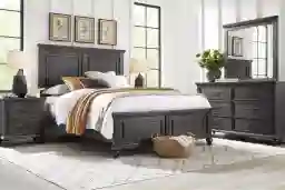 Take the long way home and tuck in with the Ridgefield bedroom's abundance of tranquility. An inviting fusion of casual and traditional influences have been poured into every piece in this set. The bed's headboard is crafted with top and bottom crown moulding details alongside eye catching panels. The design is echoed on footboard. Turned bun feet on the matching dresser punch up the style. Drawers feature English and French dovetailing with soft-close extension drawer glides. The oak veneers are finished in an ebony tone that give the room a serene final sheen while the mirror completes the look. Mattress and foundation (if required) sold separately.