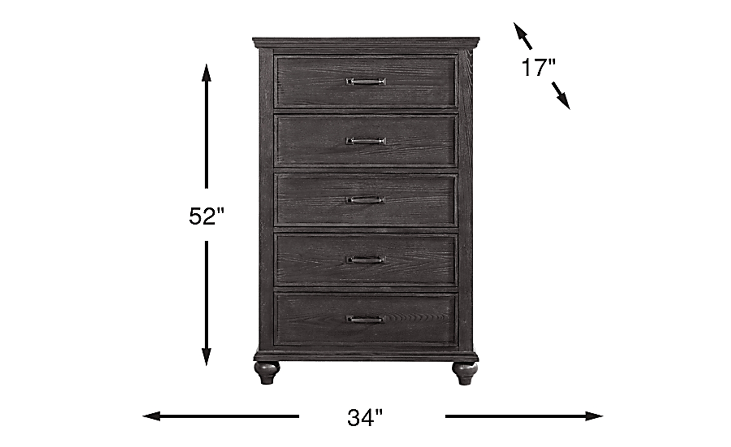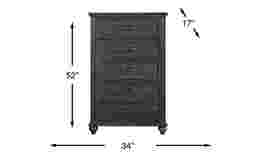 Take the long way home and tuck in with the Ridgefield collection's abundance of tranquility. An inviting fusion of casual and traditional influences have been poured into this piece's simple and stylish appearance with ebony tone finish that gives the oak veneers a serene sheen. From the crown moulding paneling to the turned bun feet, top to bottom beautiful artisanship is on full display. All five drawers feature English and French dovetailing with soft-close extension drawer glides.