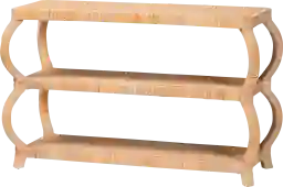 Exuberant rustic design arrives in the remarkable form of the Ridgefly light brown console table. This bohemian piece consists of a solid mahogany wood frame wrapped in natural rattan. Three tiers of open shelves offer ample space to organize and display a variety of decorations, uplifting any living room, entryway, or other open layout. The Ridgefly will arrive fully assembled and features unique rounded legs that stand out with an aura of exotic artistry while providing excellent stability. Rattan is a product of nature and may have variations in areas such as, but not limited to, color, pattern, grain and texture. The hair-like strands of rattan/rattan-fiber are common due to the nature of the material.