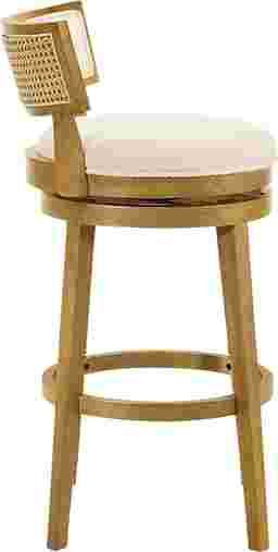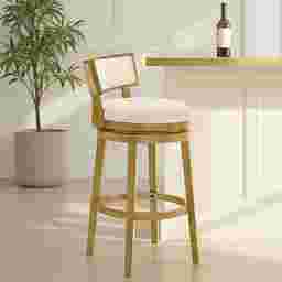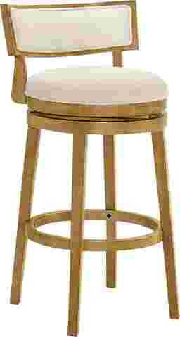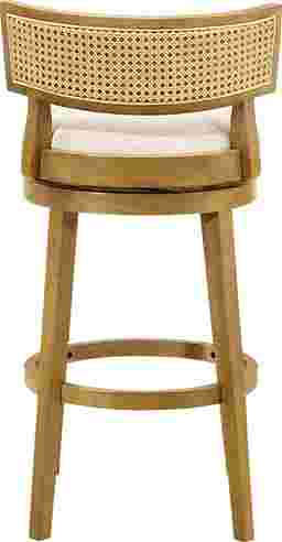 The Ridgemark barstool blends soft texture, refined geometry, and functional versatility into a design that elevates any dining or entertaining space. Its contemporary silhouette, featuring a low curved backrest inset with plush boucle upholstery, brings a polished yet welcoming character to the modern home. The stool's round cushioned seat and smooth 360-degree swivel base offer effortless comfort, making it as practical as it is visually sophisticated. Each Ridgemark stool is crafted from durable solid natural wood, chosen for its balance of strength, density, and smooth finish. This finish complements the white boucle performance fabric, creating a textural harmony that suits both minimalist and transitional decor themes. The boucle's subtle weave catches light softly, delivering an inviting aesthetic that feels luxurious yet understated. Designed with ergonomic comfort in mind, the Ridgemark stool features a low-profile, wraparound backrest that supports natural posture while maint