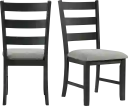 The Ridgesco Black Side Chair Set are the perfect chairs for dining or entertaining. The chairs feature a ladder back design and an upholstered seat in a grey fabric. The wire brush, black finish on the chairs is truly unique, adding instant flair to this set. Filled with high density foam for comfortable dining. The grey upholstery contrasts well with the black base and will give the updated look your dining room has been craving. Customer assembly required.