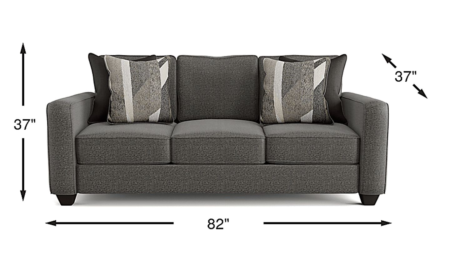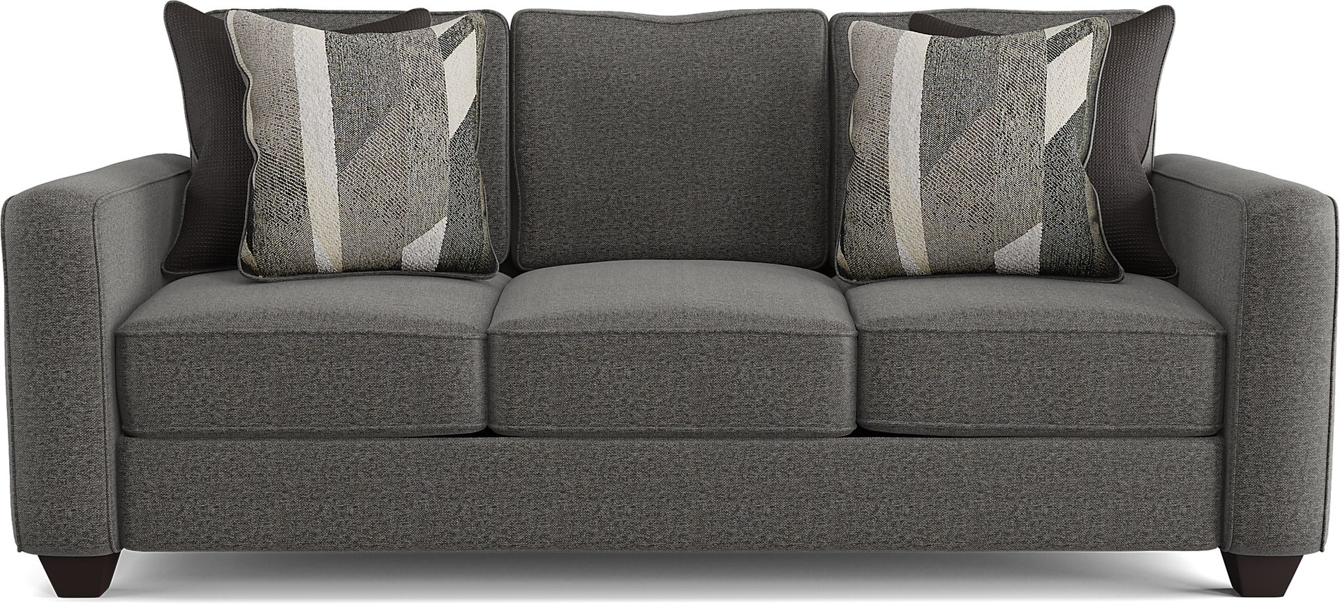 The Ridgewater sofa is the perfect place to relax with family or entertain guests during a get-together. Upholstered in a textured fabric in a graphite gray color, it creates the perfect cozy retreat for an afternoon inside. Sleek track arms, clean welted seams, and block legs all add to the tailored aesthetic, giving this sofa a refined look with casual appeal. Decorative chenille pillows add a splash of color in solid and geometric patterns. 100% Polyester