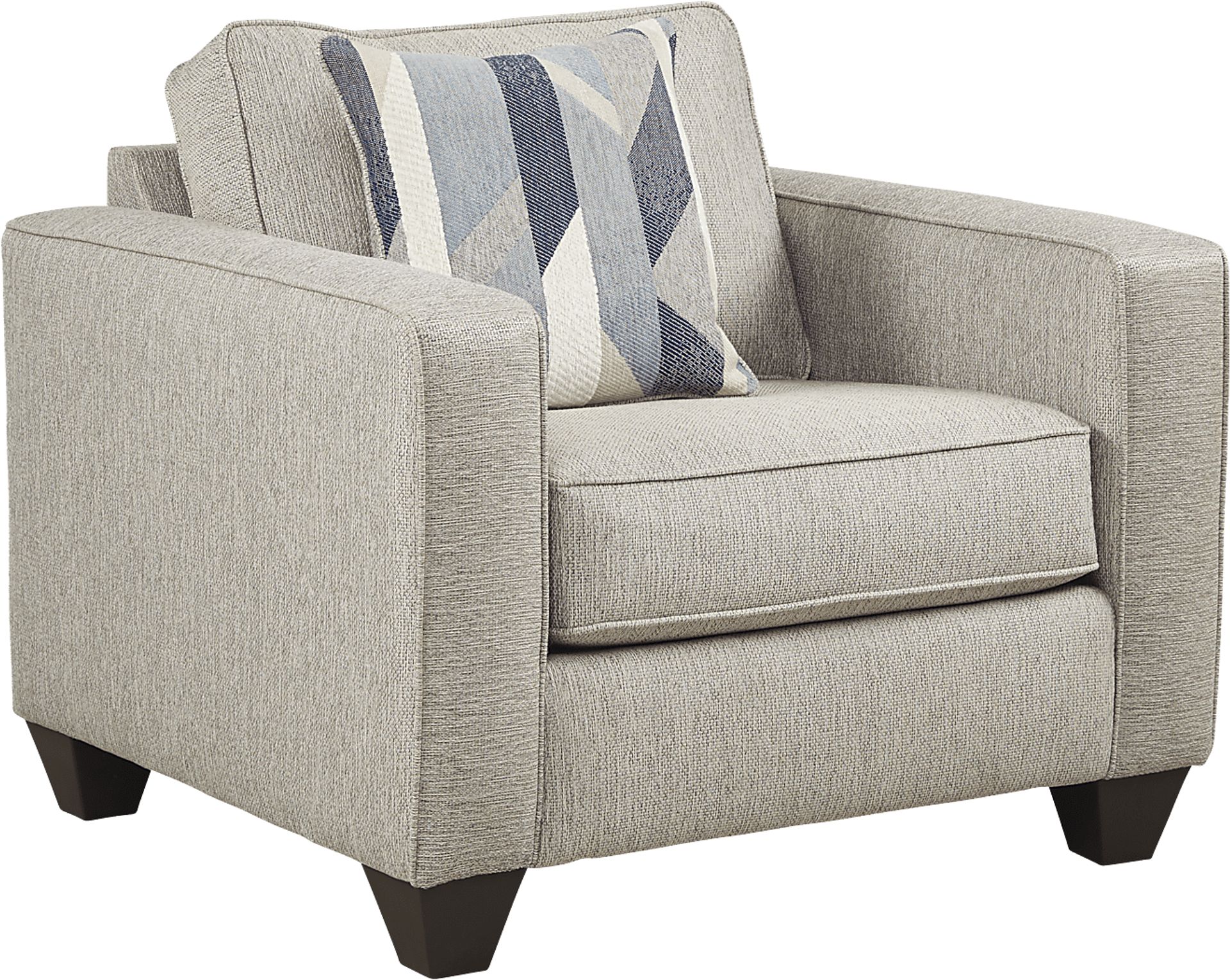 The perfect seat to round out a living arrangement, the Ridgewater chair's casual design makes it a cozy option. Upholstered in a textured fabric in a chic shade of light gray, each loose padded cushion features welted seams for a tailored look. A single decorative chenille pillow adds a colorful splash of comfort. 100% woven polyester.