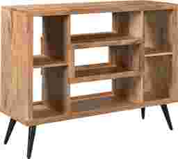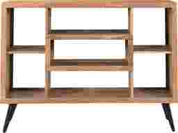 Drawing from mid-century modern style, the Riland credenza offers a wonderful way to showcase your photographs, books and artwork. Its clean lined construction includes seven open compartments plus a spacious top shelf. Crafted of acacia wood, this piece is rendered in a natural sandstone finish. Select levelers are adjustable, allowing you to customize your storage space. Tapered metal legs in a black finish are angled to create a retro-inspired look.