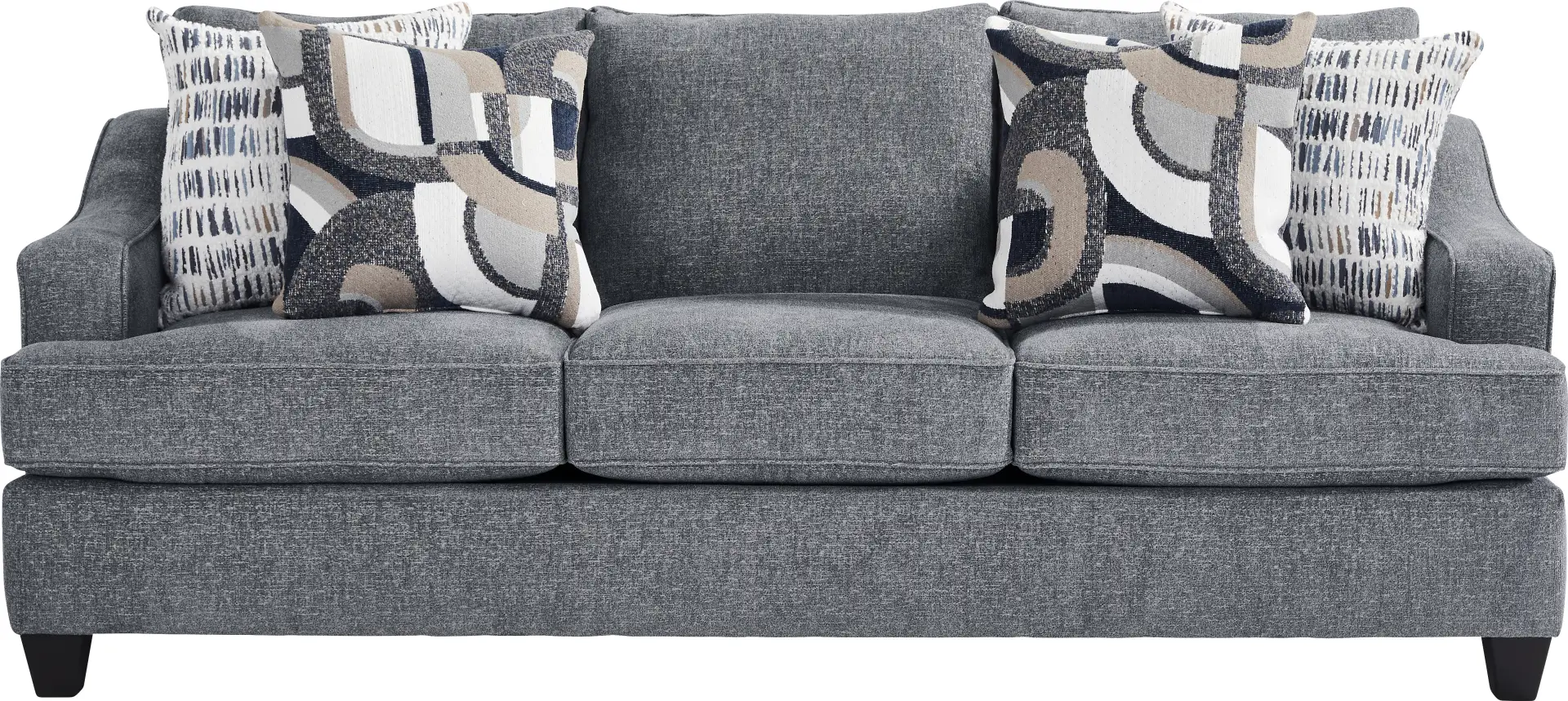 A serene, harmonious blend of quiet confidence with the freshness of a morning breeze, the Riley collection's graceful flow highlights its soft textures, captivating lines, and refined style. Upholstered in soft blue chenille, this contemporary sofa features alluring track arms that sweep low from cloud-like back cushions for an elegant silhouette. Loose back and seat cushions make maintenance effortless and relaxation more enjoyable. Chenille accent pillows add an extra layer of softness and sophistication with their complementary patterns, while tall, tapered legs finished in black perfectly complete the piece. Upholstery: 100% Polyester.