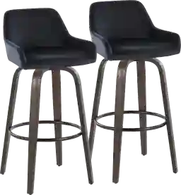 These stools feature stylish bent wood legs with a rich walnut finish. Bent wood construction is a hallmark of contemporary furniture design, offering both a unique, fluid aesthetic and impressive structural durability. The dark wood finish provides a sophisticated contrast to the black upholstery, ensuring the piece remains a focal point in your dining decor.