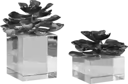 Simple elegance is achieved by these Rinita antiqued, metallic silver lotus blooms that appear to be floating on clear crystal cubes. Sizes S-6x5x6, L-6x7x6