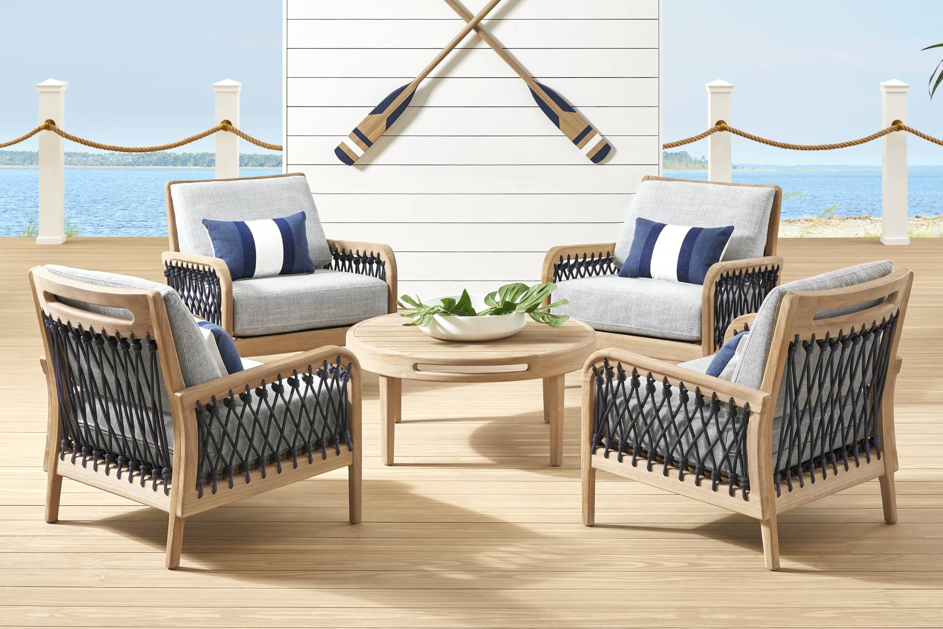 The good life is on deck with the chic and playful style of the Riva patio chat set. This stunning conversation set features frames crafted of solid teak in a blonde finish, each gently sloped arm threaded with a gorgeous lattice of marine-grade rope in colorfast navy blue secured with a nautical knot. Slate-colored reversible seat and back cushions offer plush comfort in durable, UV-resistant outdoor fabric. A cocktail table with a slatted top completes the look.