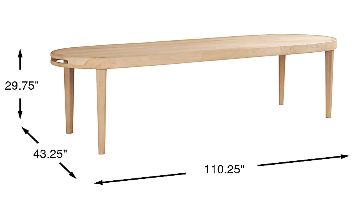 The good life is on deck with the chic and playful style of the large Riva outdoor oval dining table. This stunning piece features a frame crafted of solid teak in a blonde finish, with gently sloped sides and handsome oval knock-outs. A long 110" x 43" slatted top and tapered legs complete the look.