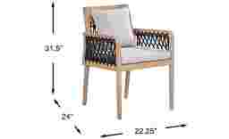 The good life is on deck with the chic and playful style of the Riva outdoor dining chair. This stunning seat features a frame crafted of solid teak in a blonde finish, each gently sloped arm threaded with a gorgeous lattice of marine-grade rope in colorfast navy blue secured with a nautical knot. Dove-colored reversible seat and back cushions offer plush comfort in durable, UV-resistant outdoor fabric.
