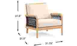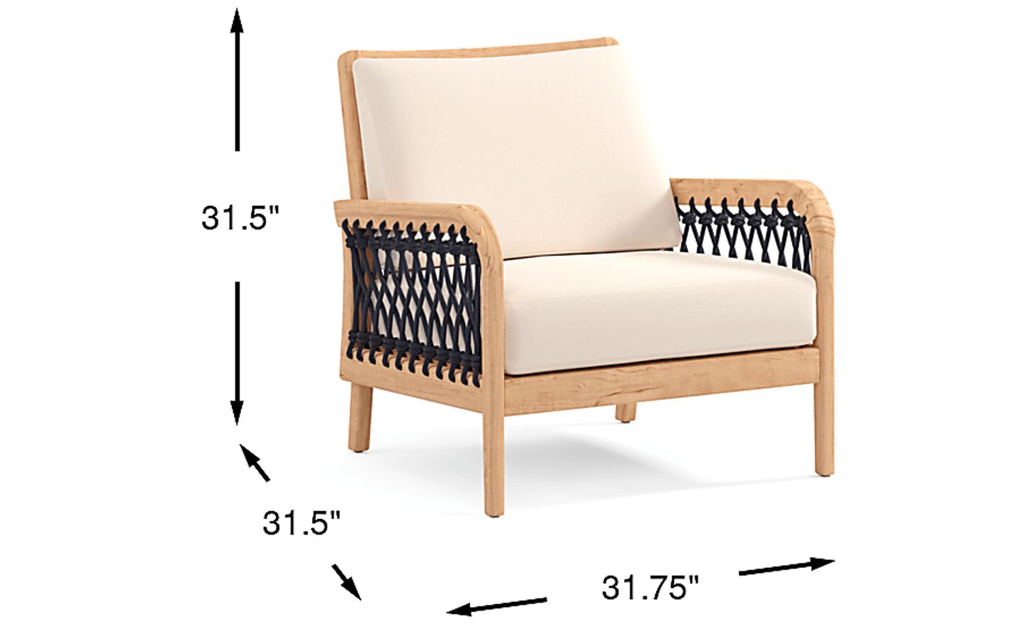 The good life is on deck with the chic and playful style of the Riva outdoor club chair. This stunning seat features a frame crafted of solid teak in a blonde finish, each gently sloped arm threaded with a gorgeous lattice of marine-grade rope in colorfast navy blue secured with a nautical knot. Flax-colored reversible seat and back cushions offer plush comfort in durable, UV-resistant Sunbrella fabric. 100% Sunbrella fabric. To clean Sunbrella fabric cushions remove dirt and spray on cleaning solution (water and mild soap), then use a soft bristle brush or sponge. Allow cleaning solution to soak into fabric and rinse thoroughly until soap residue is removed. Air dry. Do not dry clean.