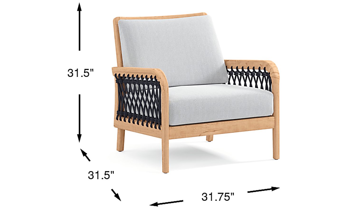 The good life is on deck with the chic and playful style of the Riva outdoor club chair. This stunning seat features a frame crafted of solid teak in a blonde finish, each gently sloped arm threaded with a gorgeous lattice of marine-grade rope in colorfast navy blue secured with a nautical knot. Slate-colored reversible seat and back cushions offer plush comfort in durable, UV-resistant outdoor fabric.