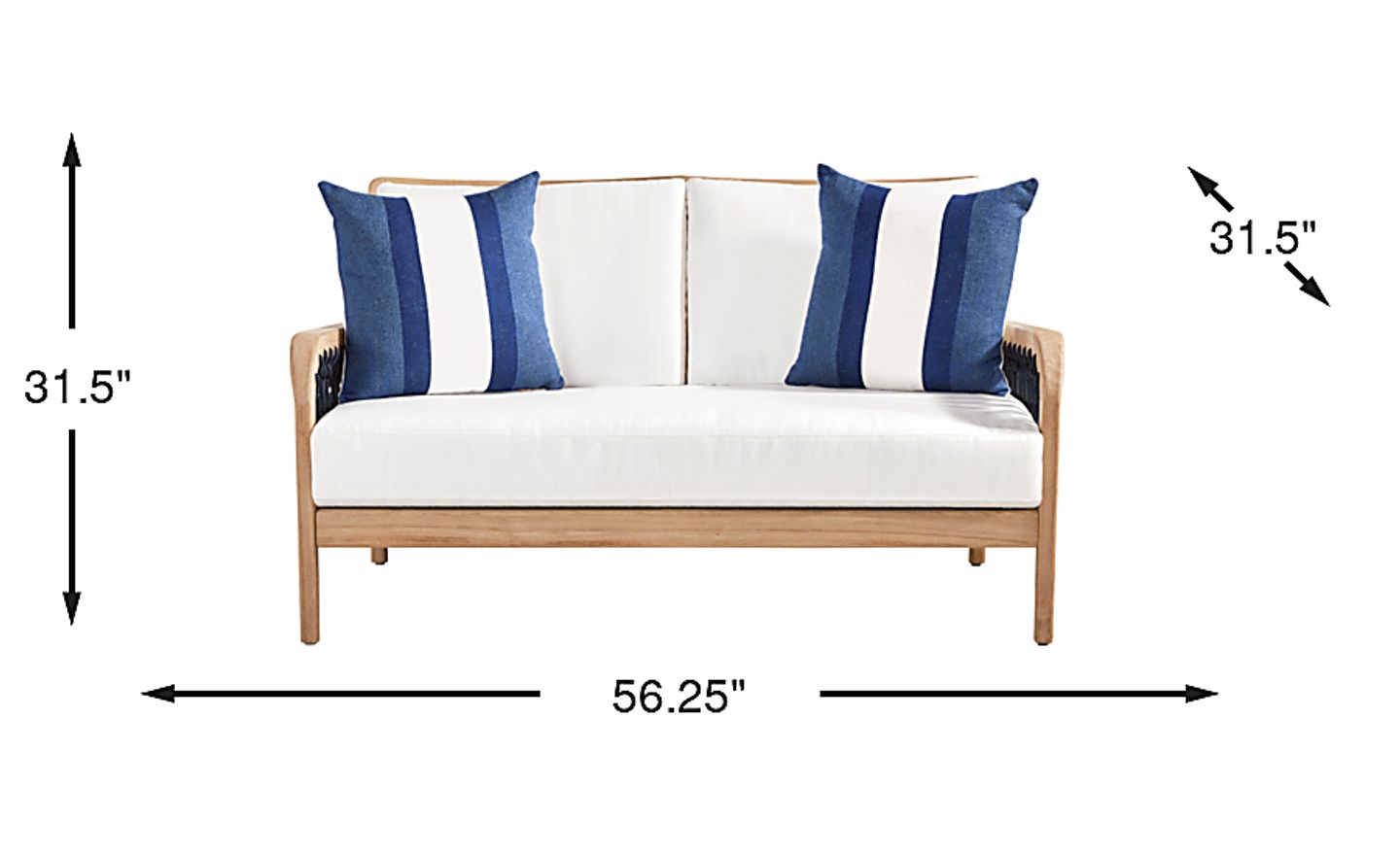 The good life is on deck with the chic and playful style of the Riva outdoor loveseat. This stunning seat features a frame crafted of solid teak in a blonde finish, each gently sloped arm threaded with a gorgeous lattice of marine-grade rope in colorfast navy blue secured with a nautical knot. Reversible seat and back cushions in white offer plush comfort in durable, UV-resistant outdoor fabric.