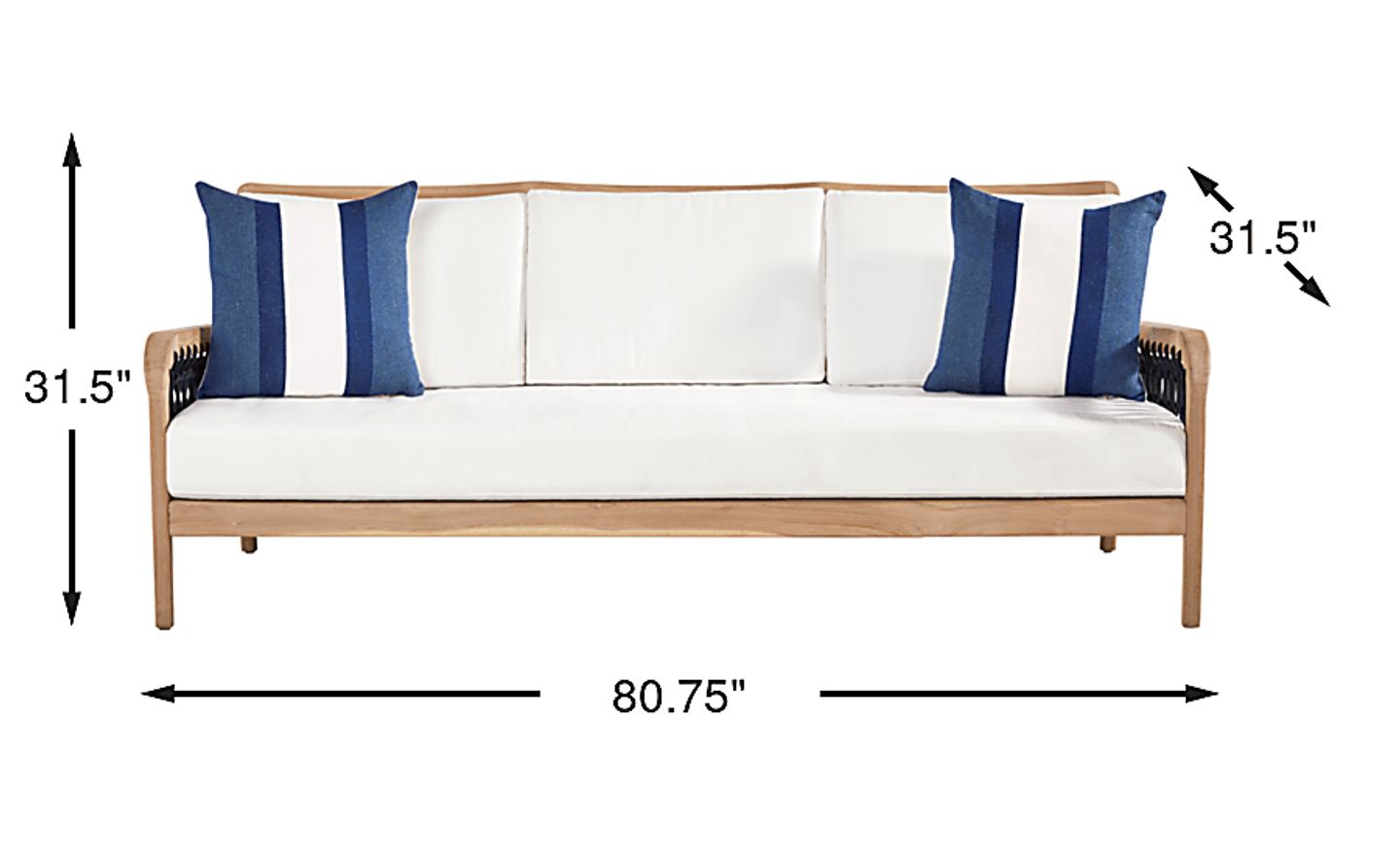 This sofa is built to perform in high-UV regions like Florida or the Southwest. The cushions use specialized UV-resistant outdoor fabric to protect against sun bleaching, while the solid teak frame is naturally resilient to heat and sun. Using high-quality, solution-dyed materials ensures the vibrant navy blue rope and crisp white cushions retain their color season after season.