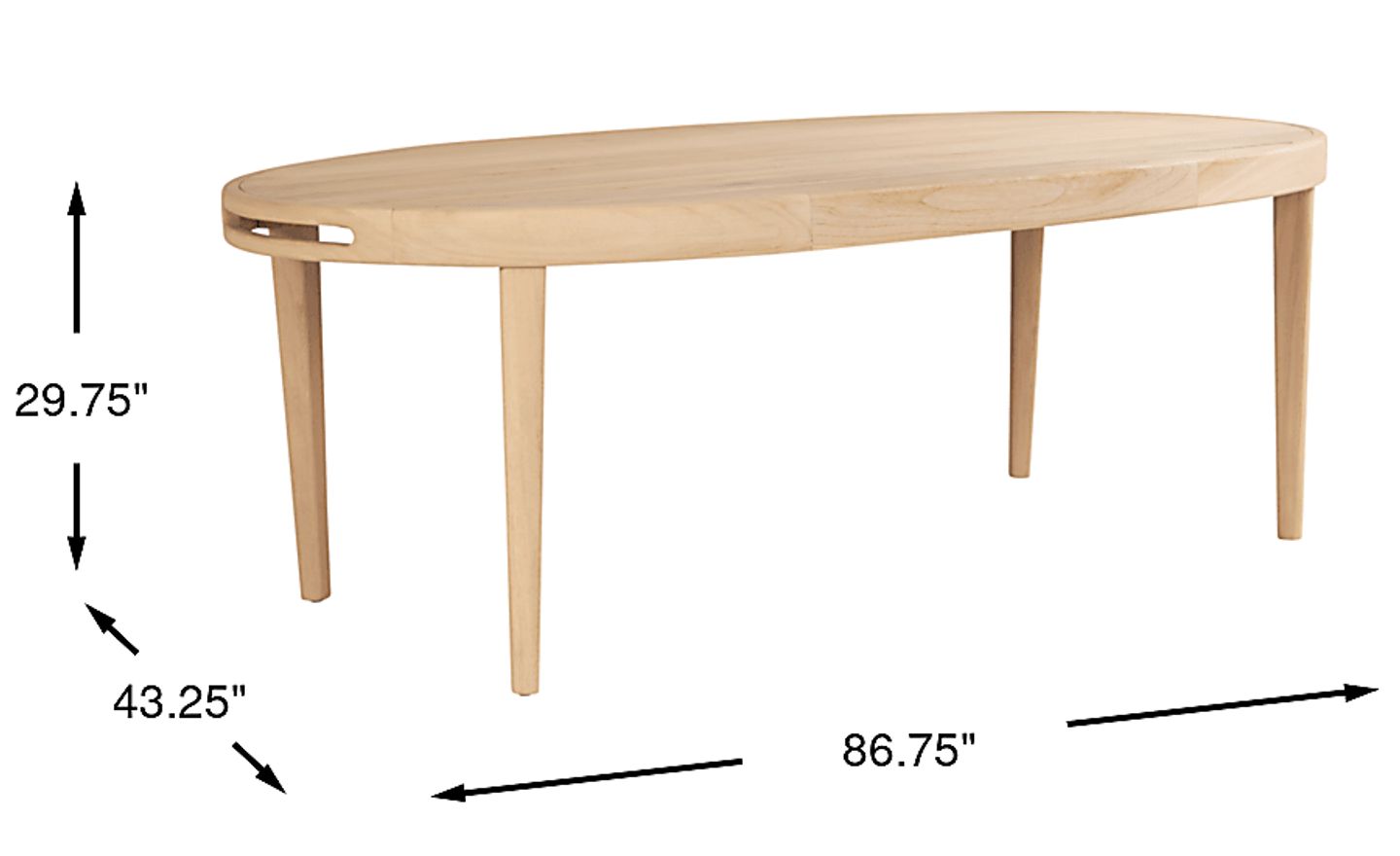 The good life is on deck with the chic and playful style of the Riva outdoor oval dining table. This stunning piece features a frame crafted of solid teak in a blonde finish, with gently sloped sides and handsome oval knock-outs. An 87" x 43" slatted top and tapered legs complete the look.