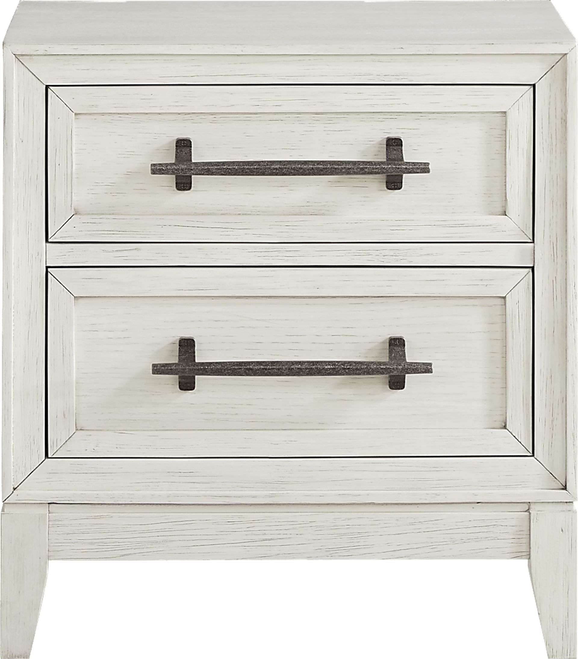The River Falls nightstand offers beautiful bedside storage with clean lines and double drawers. Each drawer is made with English dovetail joints for stability and strength while weathered pewter finished hardware adds a practical enhancement. Crafted with oak veneers, the nightstand boasts an eye-catching white finish. The bottom drawer is dust proofed to protect stored items from up drafting dust.