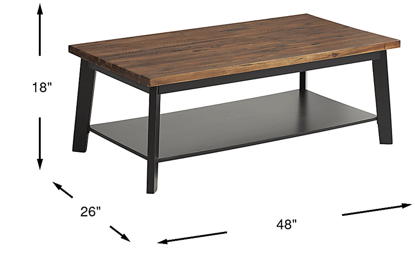 Enhance your home with the rustic style of the River Lodge cocktail table. This table boasts a two-tone dark brown and black finish. The rich dark brown tabletop, featuring weathering detail, contrasts with the angular black legs. Perfect for anchoring your living room, this table is designed with enough space to place drinks and appetizers conveniently within reach. A lower shelf offers additional room for storage and display.