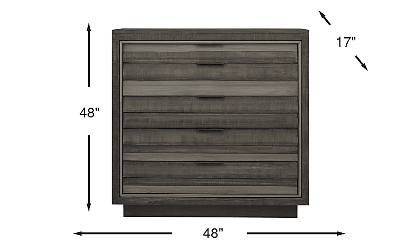 Crafted of 100% solid pine wood with a versatile graphite finish, the River Street bureau features a unique shutter design for contemporary flair. It boasts a felt-lined top drawer for delicate items, as well as four other spacious drawers for convenient storage. French dovetail drawer construction ensures lasting stability, while dark pewter tab drawer pulls offer a minimalist touch to enhance your space.