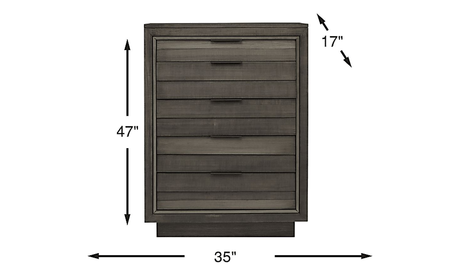 Crafted of 100% solid pine wood with a versatile graphite finish, the River Street chest features a unique shutter design for contemporary flair. It boasts a felt-lined top drawer for delicate items, as well as four other spacious drawers for convenient storage. French dovetail drawer construction ensures lasting stability, while dark pewter tab drawer pulls offer a minimalist touch to enhance your space.