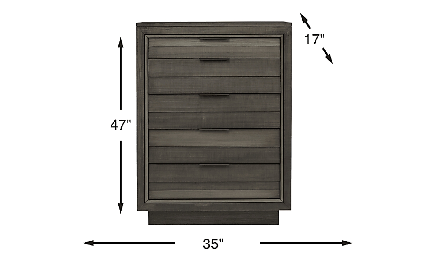 Crafted of 100% solid pine wood with a versatile graphite finish, the River Street chest features a unique shutter design for contemporary flair. It boasts a felt-lined top drawer for delicate items, as well as four other spacious drawers for convenient storage. French dovetail drawer construction ensures lasting stability, while dark pewter tab drawer pulls offer a minimalist touch to enhance your space.
