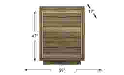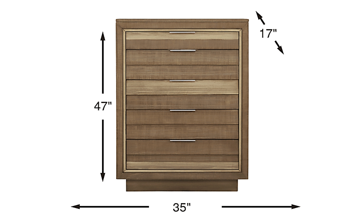 Crafted of 100% solid pine wood with a two-tone mocha and brown brushed finish, the River Street chest features a unique shutter design for contemporary flair. It boasts a felt-lined top drawer for delicate items, as well as four other spacious drawers for convenient storage. French dovetail drawer construction ensures lasting stability, while dark pewter tab drawer pulls offer a minimalist touch to enhance your space.