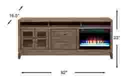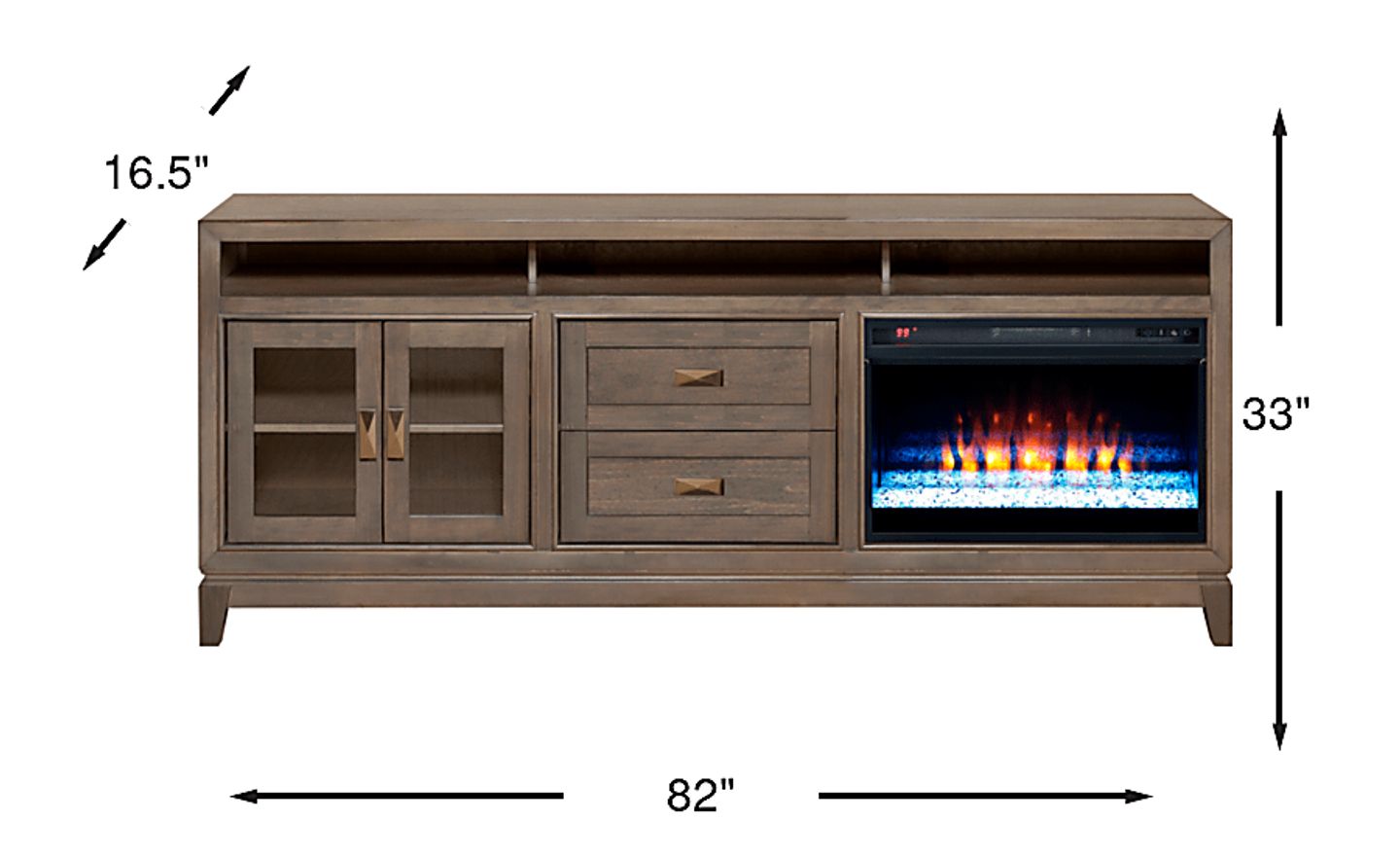 Covering all of your entertainment needs, the River Terrace 82 in. console poses a sleek contemporary style to showcase your television. Crafted of okoume solids and veneers, this versatile piece is finished in a warm gray color. An open cubby, featuring a removable shelf, creates the perfect place for electronic equipment. Two center drawers offer hidden space for additional items. On the left side, two framed glass doors open to reveal more storage with a shelf inside. Pyramid-shaped hardware adds a sophisticated touch to this console, giving it a modern look. Convenient self-closing hinges on both doors help keep your space looking neat and tidy. The removable fireplace features an energy-saving LED firebox with remote controlled heat and ambient lighting with four color changing options (used with or without heat). When in use it can heat up to 400 square feet in a room and offers 50,000 hours of LED light. (Plugs into a standard electrical outlet max. 120V and 60Hz.)