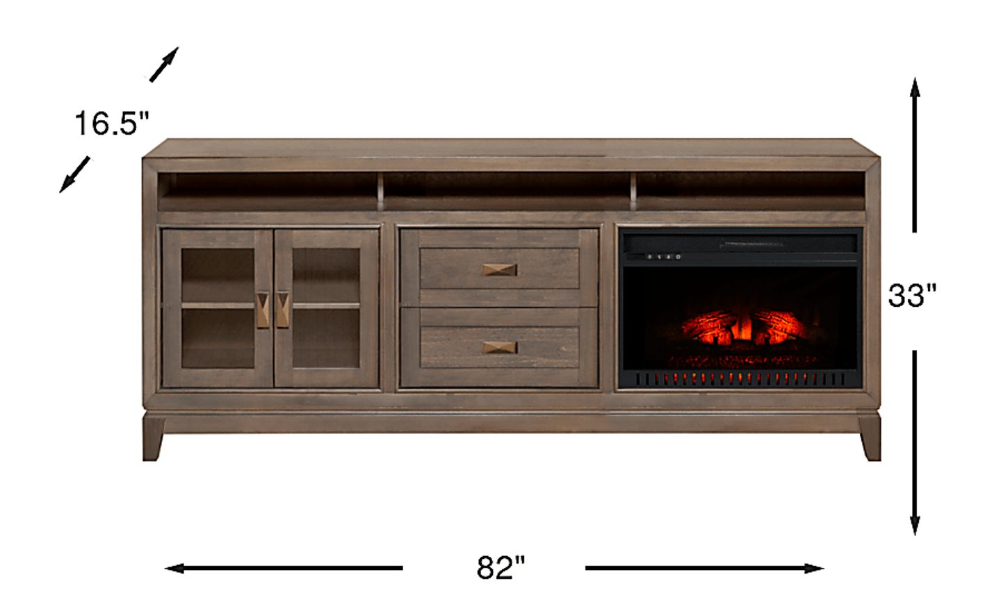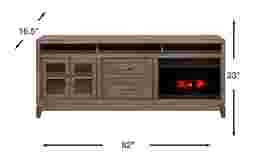Covering all of your entertainment needs, the River Terrace 82 in. console poses a sleek contemporary style to showcase your television. Crafted of okoume solids and veneers, this versatile piece is finished in a warm gray color. An open cubby, featuring a removable shelf, creates the perfect place for electronic equipment. Two center drawers offer hidden space for additional items. On the left side, two framed glass doors open to reveal more storage with a shelf inside. Pyramid-shaped hardware adds a sophisticated touch to this console, giving it a modern look. Convenient self-closing hinges on both doors help keep your space looking neat and tidy. The electric fireplace features innovative flame effects on bricks and logs for added depth and 3D realism. A convenient remote control adjusts the flame and glow levels and includes a built-in timer (from 30 minutes to 60 hours). The adjustable thermostat ranges from 62 degrees to 82 degrees.