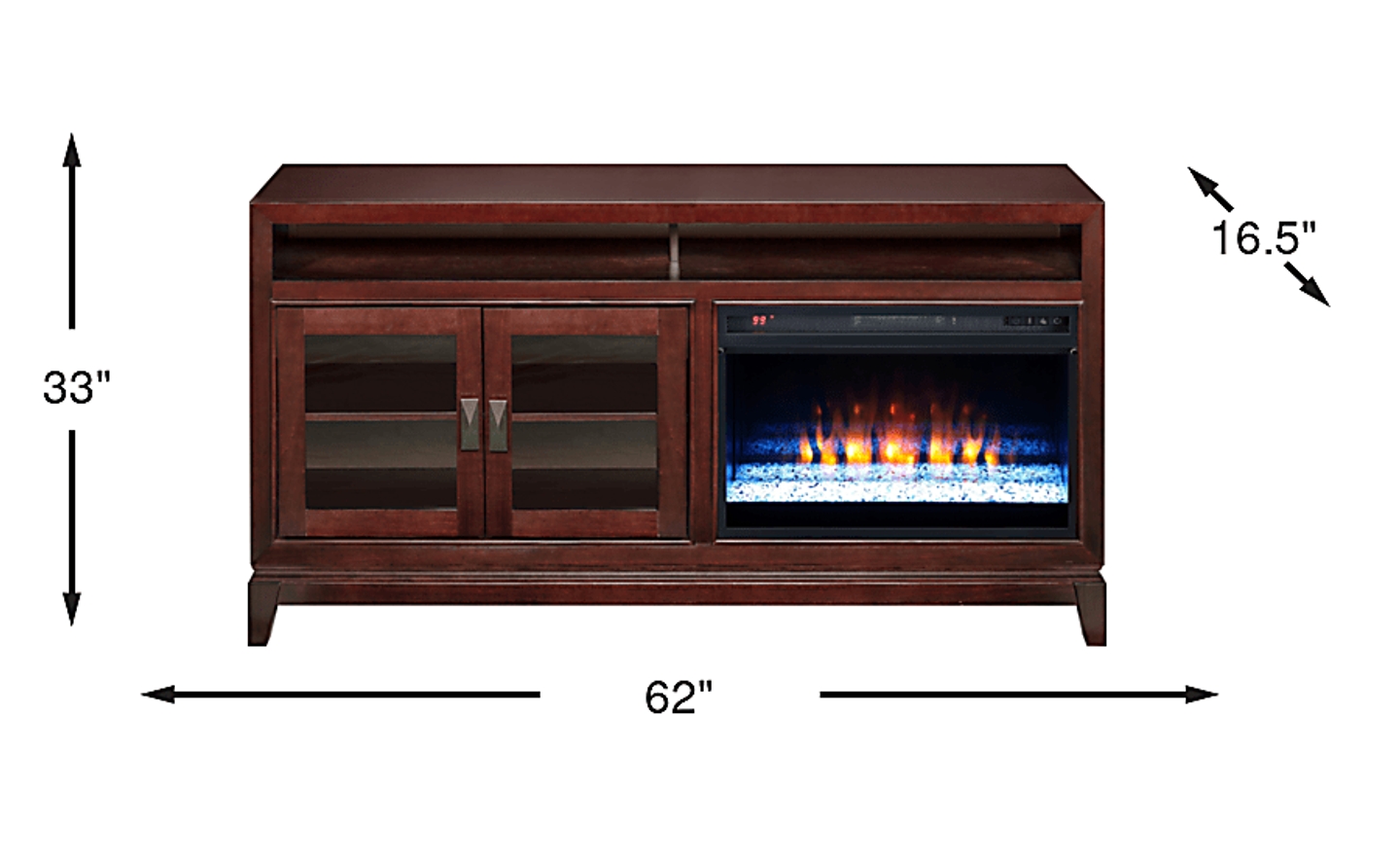 Designed for your entertainment needs, the River Terrace 62 in. console poses a sleek contemporary style to update any room. Crafted of okoume solids and veneers, this versatile piece is finished in a rich merlot color. An open cubby, featuring a removable shelf, creates the perfect place for electronic equipment. On the left side, two framed glass doors open to reveal a storage area with an adjustable shelf that allows you to adapt compartments. Pyramid-shaped hardware adds a sophisticated touch to this console, giving it a modern look. Convenient self-closing hinges on both doors help keep your space looking neat and tidy. The removable fireplace portion features a realistic energy-saving LED firebox with remote controlled heat and ambient lighting with four color changing options (color effects can be used with or without heat). When in use it can heat up to 400 square feet in a room and offers 50,000 hours of LED light. (Plugs into a standard electrical outlet max. 120V and 60Hz.)