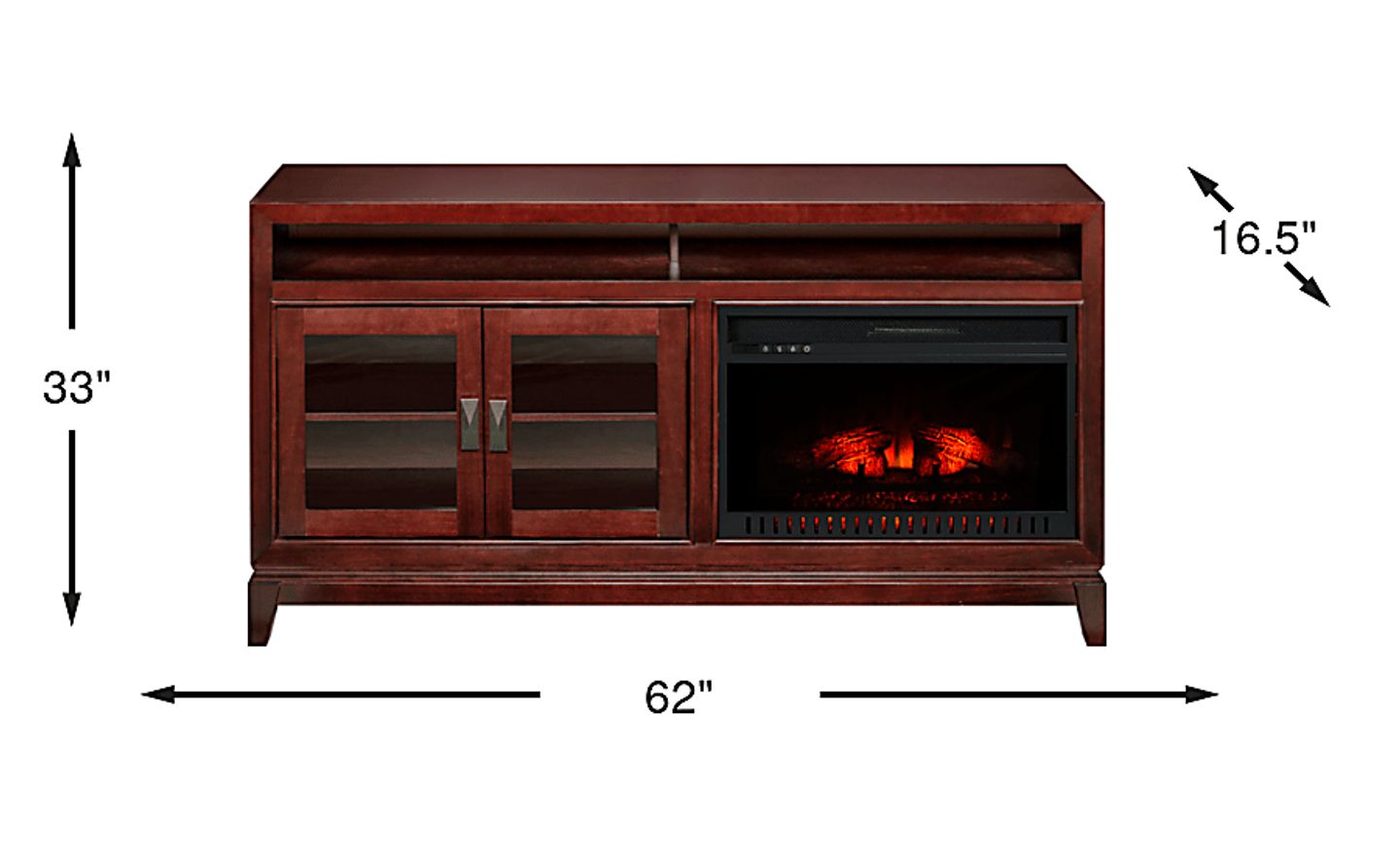 Designed for your entertainment needs, the River Terrace 62 in. console poses a sleek contemporary style to update any room. Crafted of okoume solids and veneers, this versatile piece is finished in a rich merlot color. An open cubby, featuring a removable shelf, creates the perfect place for electronic equipment. On the left side, two framed glass doors open to reveal a storage area with an adjustable shelf that allows you to adapt compartments. Pyramid-shaped hardware adds a sophisticated touch to this console, giving it a modern look. Convenient self-closing hinges on both doors help keep your space looking neat and tidy. The electric fireplace features innovative flame effects on bricks and logs for added depth and 3D realism. A convenient remote control adjusts the flame and glow levels and includes a built-in timer (from 30 minutes to 60 hours). The adjustable thermostat ranges from 62 degrees to 82 degrees.