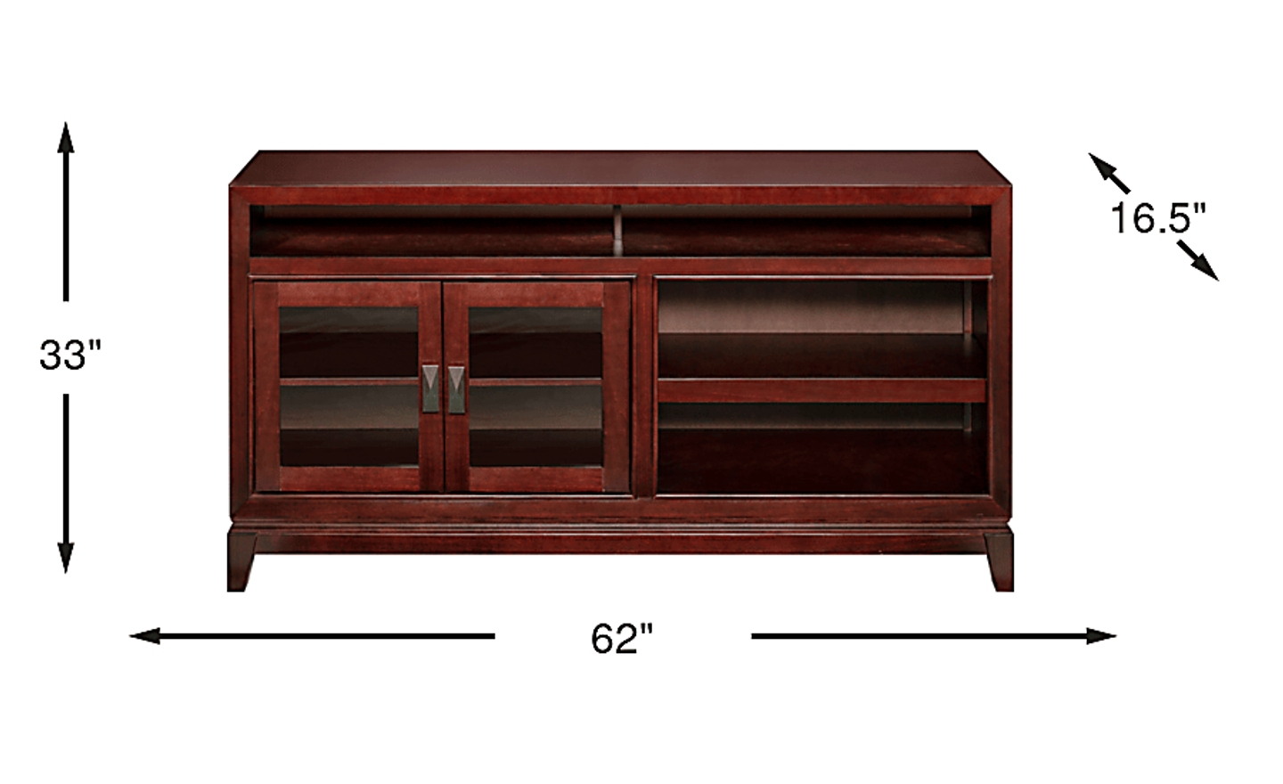 Designed for your entertainment needs, the River Terrace 62 in. console poses a sleek contemporary style to update any room. Crafted of okoume solids and veneers, this versatile piece is finished in a rich merlot color. An open cubby, featuring a removable shelf, creates the perfect place for electronic equipment. On the left side, two framed glass doors open to reveal a storage area with an adjustable shelf that allows you to adapt compartments. Pyramid-shaped hardware adds a sophisticated touch to this console, giving it a modern look. Convenient self-closing hinges on both doors help keep your space looking neat and tidy.