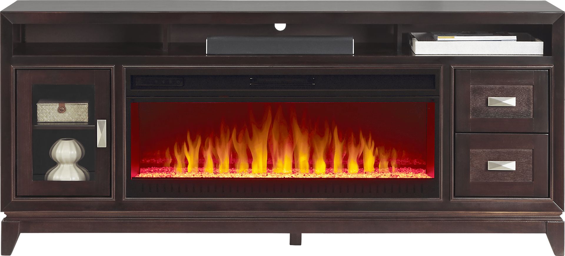 Designed for your entertainment needs, the River Terrace 76 in. console poses a sleek contemporary style to update any room and give you functional storage space. Crafted of okoume solids and veneers, this versatile piece is finished in a rich merlot color. The removable fireplace portion features an energy-saving LED firebox with remote controlled heat and ambient lighting. When in use it can heat up to 400 square feet in a room and offers 50,000 hours of LED light. (Plugs into a standard electrical outlet max. 120V and 60Hz.) Pyramid-shaped hardware adds a sophisticated touch to this console, giving it a modern look.