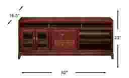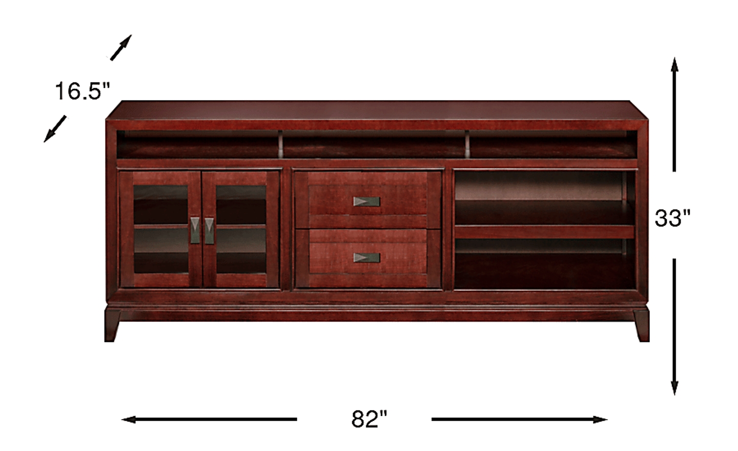 Covering all of your entertainment needs, the River Terrace 82 in. console poses a sleek contemporary style to showcase your television. Crafted of okoume solids and veneers, this versatile piece is finished in a rich merlot color. An open cubby, featuring a removable shelf, creates the perfect place for electronic equipment. Two center drawers offer hidden space for additional items. On the left side, two framed glass doors open to reveal more storage with a shelf inside. Pyramid-shaped hardware adds a sophisticated touch to this console, giving it a modern look. Convenient self-closing hinges on both doors help keep your space looking neat and tidy.