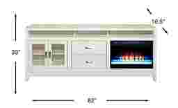 Covering all of your entertainment needs, the River Terrace 82 in. console poses a sleek contemporary style to showcase your television. Crafted of okoume solids and veneers, this versatile piece is finished in an off-white color. An open cubby, featuring a removable shelf, creates the perfect place for electronic equipment. Two center drawers offer hidden space for additional items. On the left side, two framed glass doors open to reveal more storage with a shelf inside. Pyramid-shaped hardware adds a sophisticated touch to this console, giving it a modern look. Convenient self-closing hinges on both doors help keep your space looking neat and tidy. The removable fireplace features an energy-saving LED firebox with remote controlled heat and ambient lighting with four color changing options (used with or without heat). When in use it can heat up to 400 square feet in a room and offers 50,000 hours of LED light. (Plugs into a standard electrical outlet max. 120V and 60Hz.)