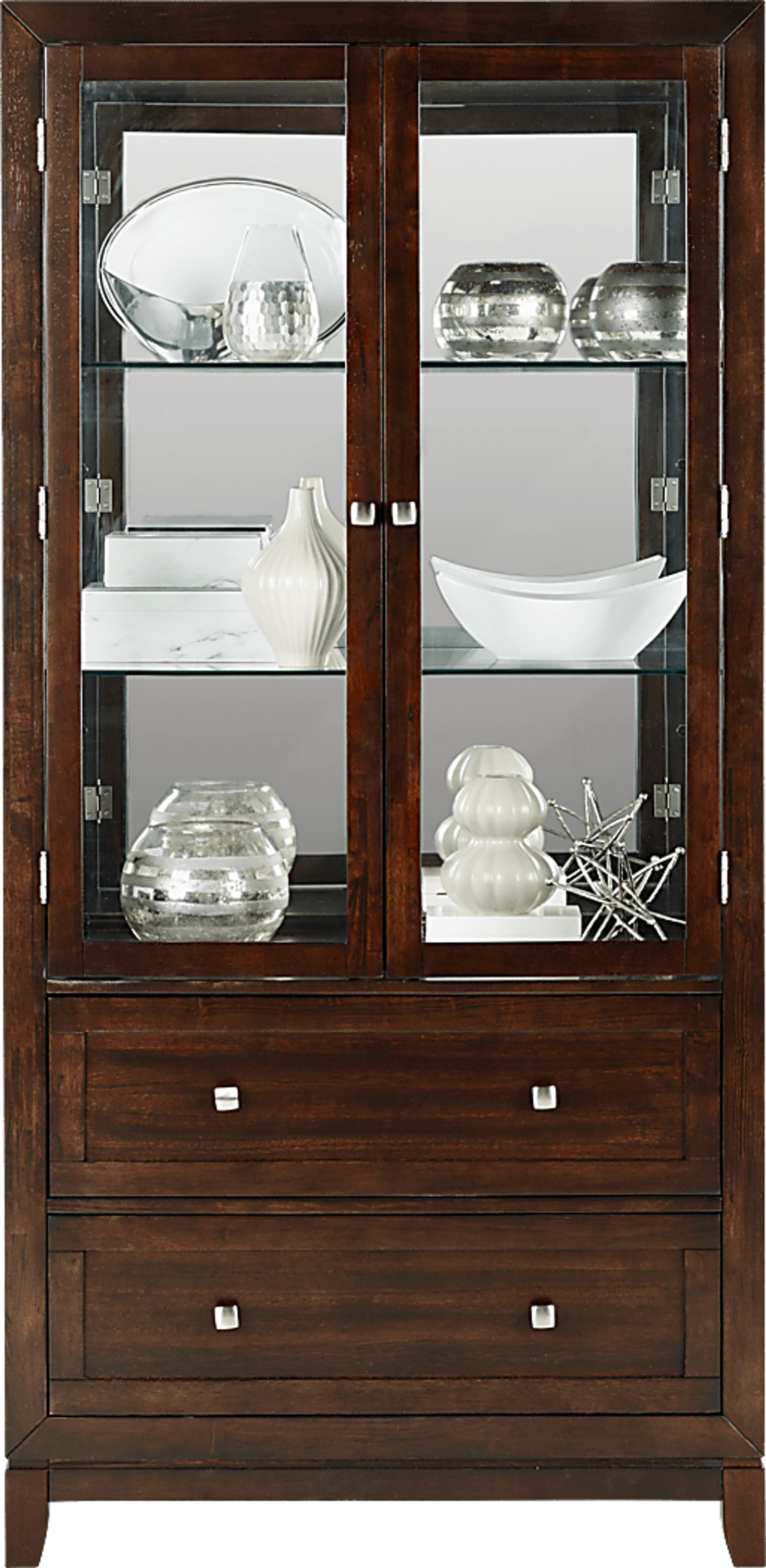 Combining display and storage space, the Riverdale curio will make a wonderful addition to almost any dining room. Glass on the sides and doors allows a clear view of collectibles, while the mirrored back and touch light further enhance your favorite pieces. Two roomy drawers below are ideal for keeping clutter under control. Silver toned hardware provides a nice contrast to the curio's dark cherry finish. The piece is quality made of wood solids and cherry veneers.