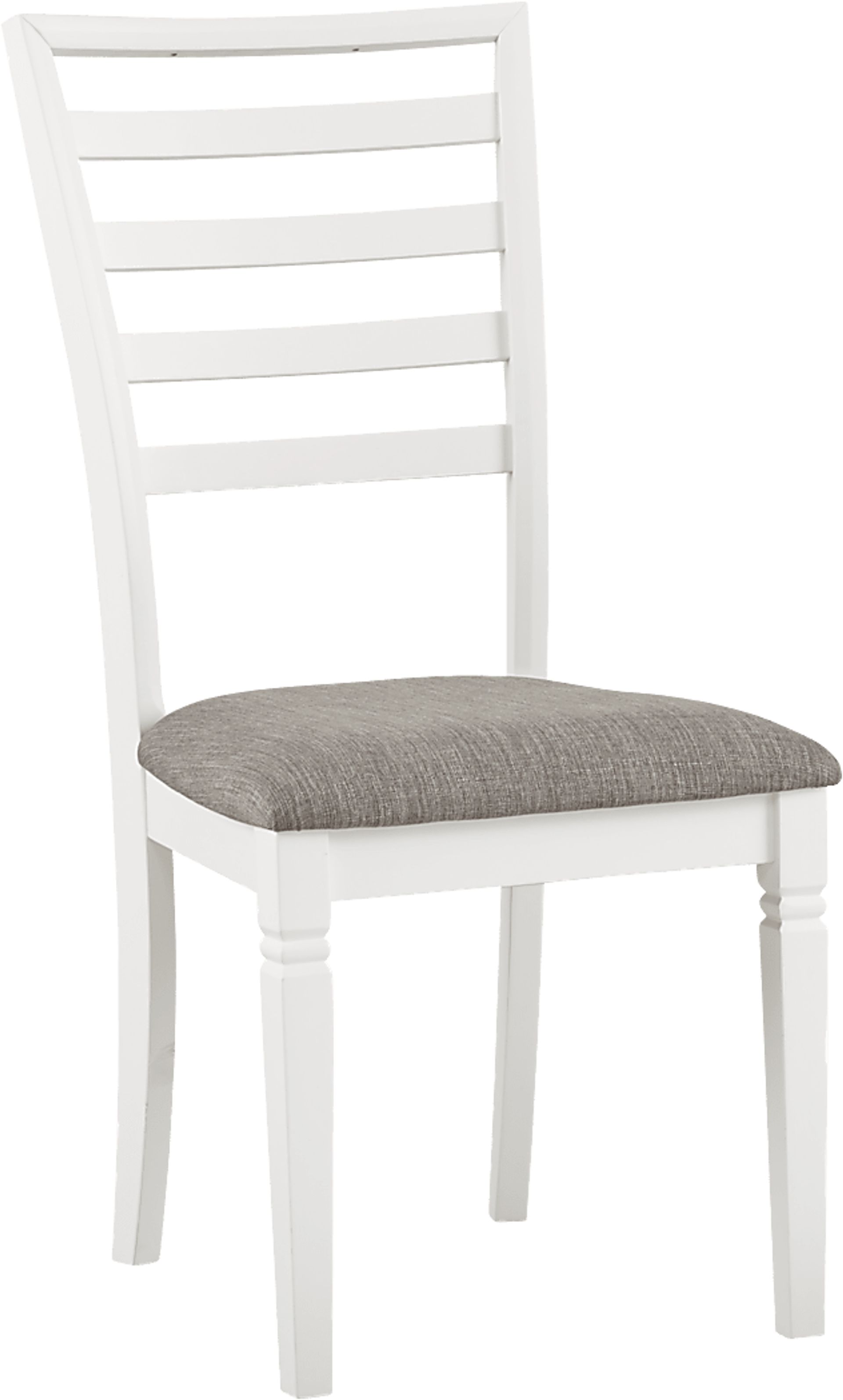 Classic ladder back styling and a comfortable padded gray seat combine to create the Riverdale side chair. Tapered wooden legs, in a white finish, provide sturdy support.