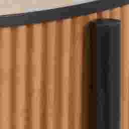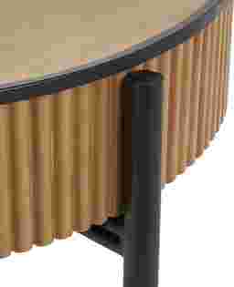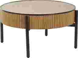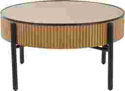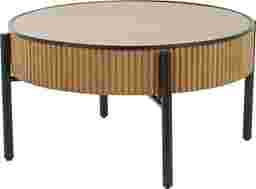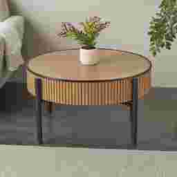 Designed with timeless sophistication, rich old-world textures and warm hues come together for a refined classic taste of luxury with the Rizro coffee table. This brown living room coffee table is crafted from premium high-quality rubber wood, MDF, and metal for the base, ensuring its durability and elegance. Round living room furniture is a matte brown wooden coffee table featuring a slatted accent, and contrasting matte black legs. This MDF coffee table boasts an intricate wood slatted design that lends texture and visual interest, enhancing the overall aesthetic with a rustic charm. Customer service is required.