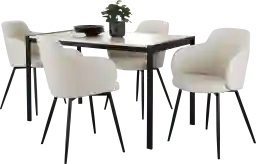 With a simple and sleek table, and an accent of comfortable chairs, the Roama Cream 5 Pc Dining Set will be a great addition to a modern kitchen or break room. With a contemporary styling, this is a beautifully curated set to make life stylish and easy. With a seating capacity of four, this dining set would be perfect in any dining room, kitchen, or breakroom. Customer assembly required.
