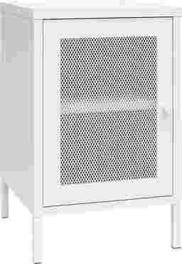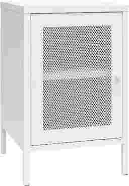 Give your living space an industrial feel with the Roaris Side Table with a perforated metal mesh door. Crafted with durable powder-coated metal, this side table brings a contemporary touch to your room in a soothing neutral painted finish. Use in your livingroom, bedroom, or anywhere that you can use a little extra storage.