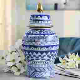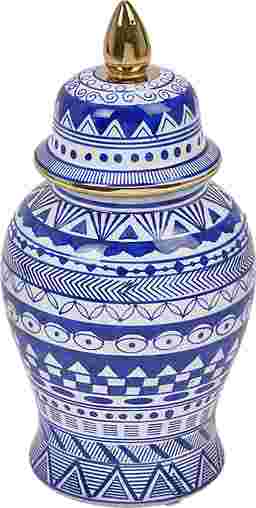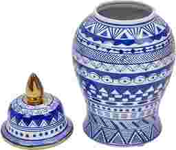 The Rockcrest ceramic templar jar can also be used as a vase. It has a blue and white color with and a gold rim on the top.