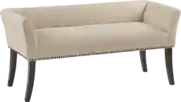 Accent your home with the simple elegance of the Rockglen accent bench. Upholstered in a cream color fabric, this bench features a low back and flared arms that create a sleek and sophisticated look. A bronze nailhead trim adds elegant accent, while the light wood finish complements the upholstery. Perfect for your bedroom or living room, this upholstered bench provides a chic update to your home decor. Customer assembly is required.