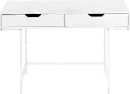 A stylish study in contrasts, this streamlined Rockmart computer desk will add style to any room. Finished in a smooth, white laminate, the desktop has a substantial appearance thanks to an ample work surface and built-in drawers. The 2 storage drawers are wide and deep, offering room for supplies like writing materials and even letter- and legal-size papers. Supporting the top is a sturdy base in a matching white finish with slender metal legs that are recessed for a striking look. With its clean design and compact size, this modern laptop desk is ideal for smaller home offices and is attractive enough to also serve as an accent table. Customer assembly is required.