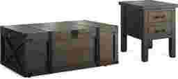 Comforting nostalgia meets a lively new perspective when the Rocky Creek table set finds its home in your space. A cocktail table modeled after a whimsical antique trunk centers this collection, offering a lift-up top with storage space beneath wood planks in a deep brown finish and riveted black metal details. A matching chairside table features two storage drawers with metal bar pulls and a power station with convenient outlets and USB ports. Customer assembly required.