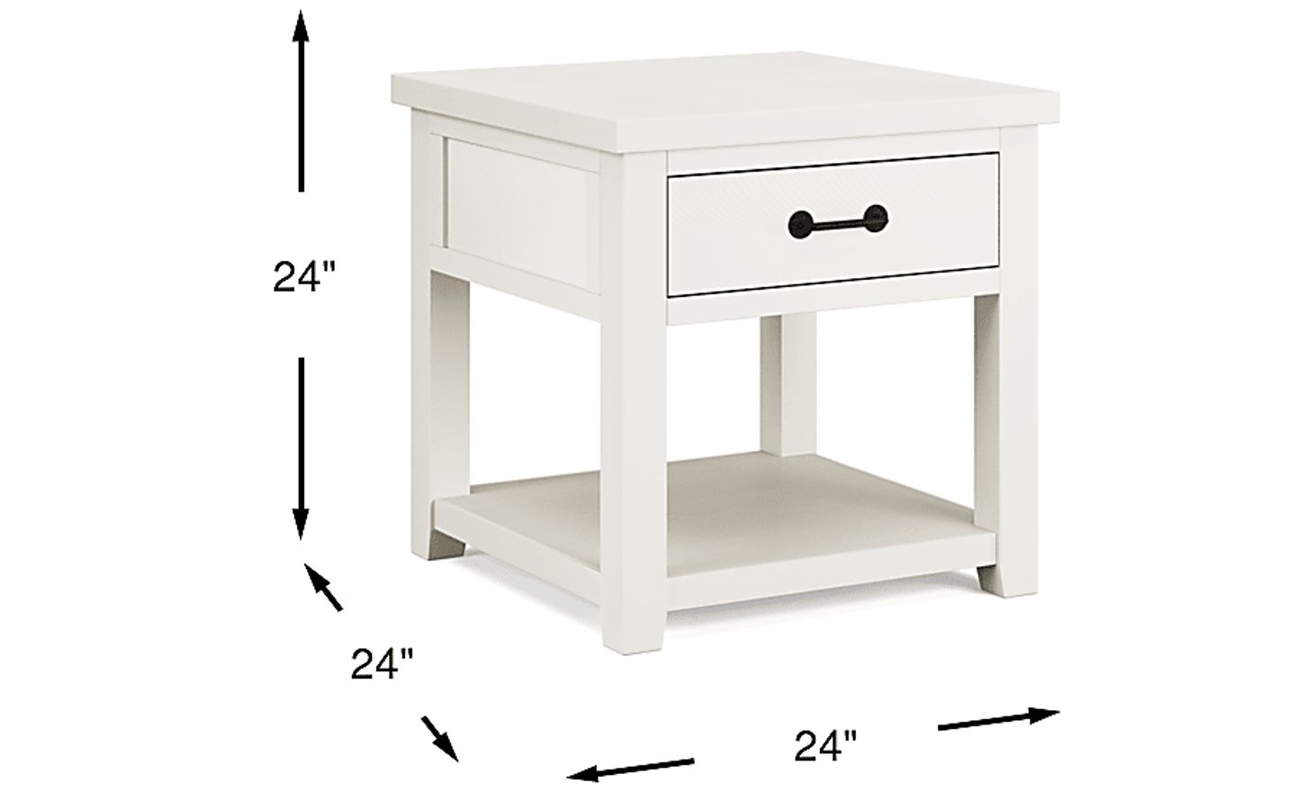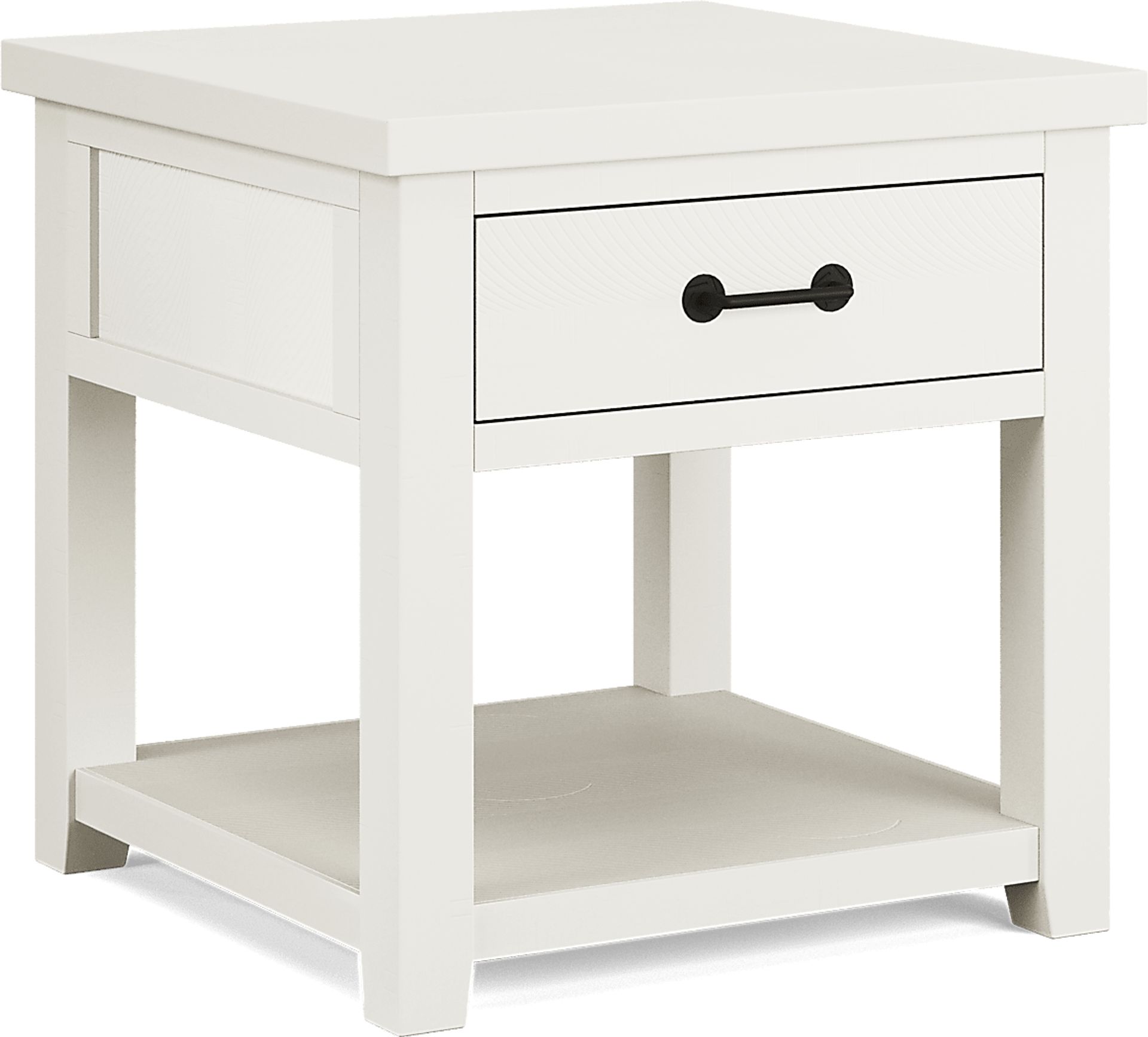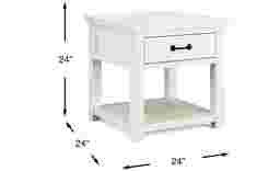 Comforting nostalgia meets a lively new perspective when the Rocky Creek end table finds its home in your space. Offering wood planks in a white finish as well as handsome black metal hardware, this piece has a storage drawer and a handy open shelf beneath.