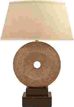 With the look of a contemporary sculpture the Rocky Mountain lamp is both decorative and functional. Made of hydrocal the lamp's body has an earthy, stone granite finish with a deep chocolate base. A beige shade adds the final touch.