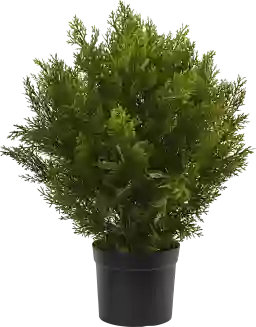 This cedar bush comes complete with a round, black plastic pot, providing a stable and neutral base immediately upon arrival. While it is ready to use as-is for a casual, modern look, the pot’s 20-inch diameter scale also allows it to be easily placed inside a larger decorative planter or ceramic garden stool to match your specific seasonal decor or holiday accessories.
