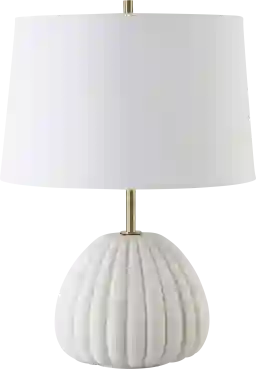The Rolyat Bay White Lamp adds an air of elegance and sophistication to any space. The body of the lamp is crafted from white man-made stone that accurately replicates the look of Thassos marble featuring elegant curves and deep channels, accented with plated brass details. The tapered round hardback shade is a crisp white linen fabric. Partial assembly may be required.